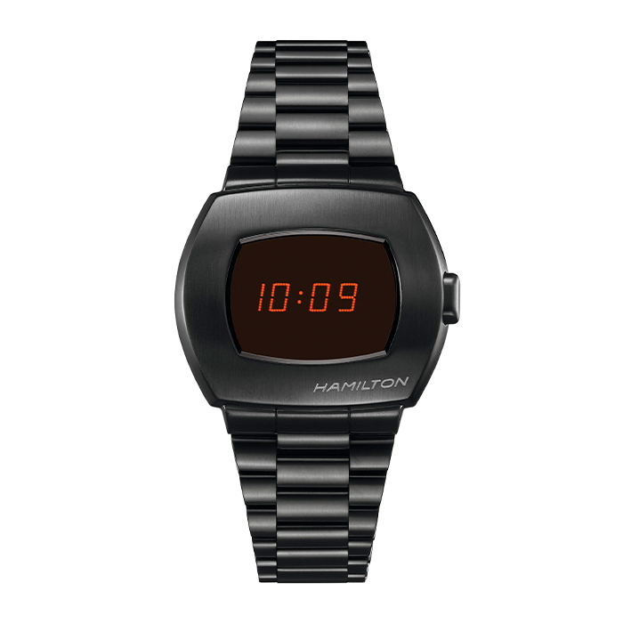 Esta sofisticada reinterpretación completamente negra del icónico Hamilton PSR Digital Quartz supone una continuación de la historia de innovación inaugurada por el primer reloj eléctrico del mundo en 1970. Con una pantalla digital que combina las tecnologías LCD y OLED, sus números rojos son fáciles de leer a simple vista durante el día y cuenta con un pulsador para mejorar la legibilidad durante la noche.