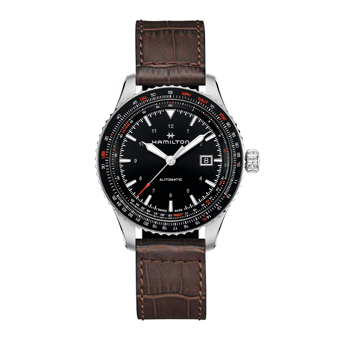 La tecnología avanzada se combina con el estilo sofisticado en el reloj Khaki Aviation Converter. La regla de cálculo del bisel giratorio bidireccional permite realizar importantes cálculos y conversiones fácilmente, y la más avanzada de las aleaciones antimagnéticas de espiral, NivachronTM, le garantiza precisión en cualquier entorno. Perfecta para el piloto moderno o para urbanitas pudientes, la elegante esfera negra de 42 mm cubre el movimiento automático H-10 con reserva de marcha de 80 horas.