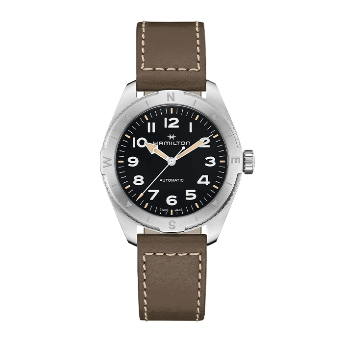 Prepárate para tus actividades al aire libre con el Khaki Field Expedition, un reloj de aventura todoterreno con un diseño de brújula que te permite proseguir la aventura con la ayuda del sol. Se alberga en una caja de acero inoxidable de 41 mm junto con una correa de piel verde, y está equipado con una corona atornillada para proteger el movimiento contra las inclemencias del tiempo. El Khaki Field Expedition, dotado de una esfera negra texturizada con revestimiento de Super-Luminova® para conseguir la máxima legibilidad, te ofrece la resistencia que necesitas.